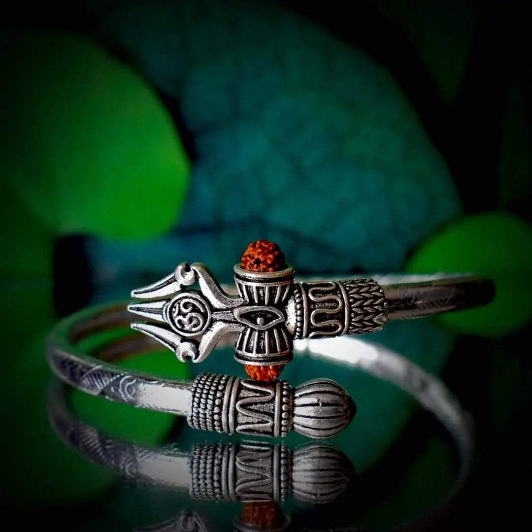 Plated with pure silver, this unisex bracelet is created with Rudraksha beads, Trishul and Damru that has AUM engraved on it.