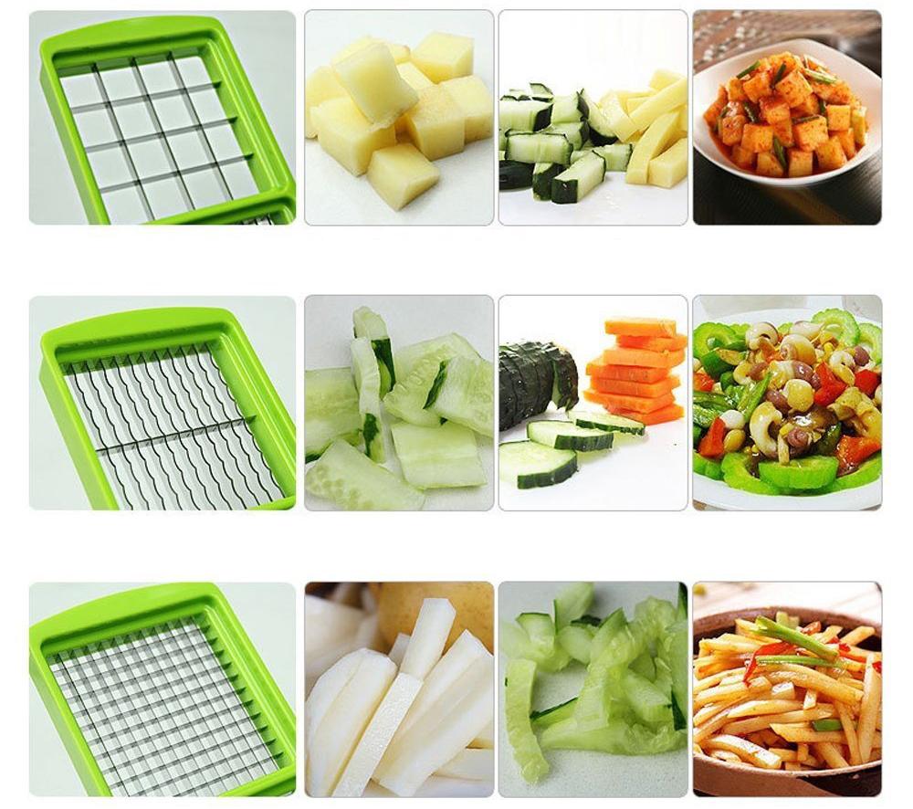 There are 5 blades, each made of ultra-sharp stainless steel. Just press down the lid and they'll easily cut through virtually any food. Each of these blades offers different cutting sizes, cut into segments of four and eight, and cuts cubes in three different sizes for your different preparation needs.
